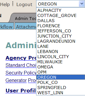 Civic Platform provides a way for a multi-agency user to switch from one agency to another. After a user logs into their primary agency, Civic Platform displays a drop-down list in the upper areas of the page. This list populates with the sub-agencies where they have delegate user access.