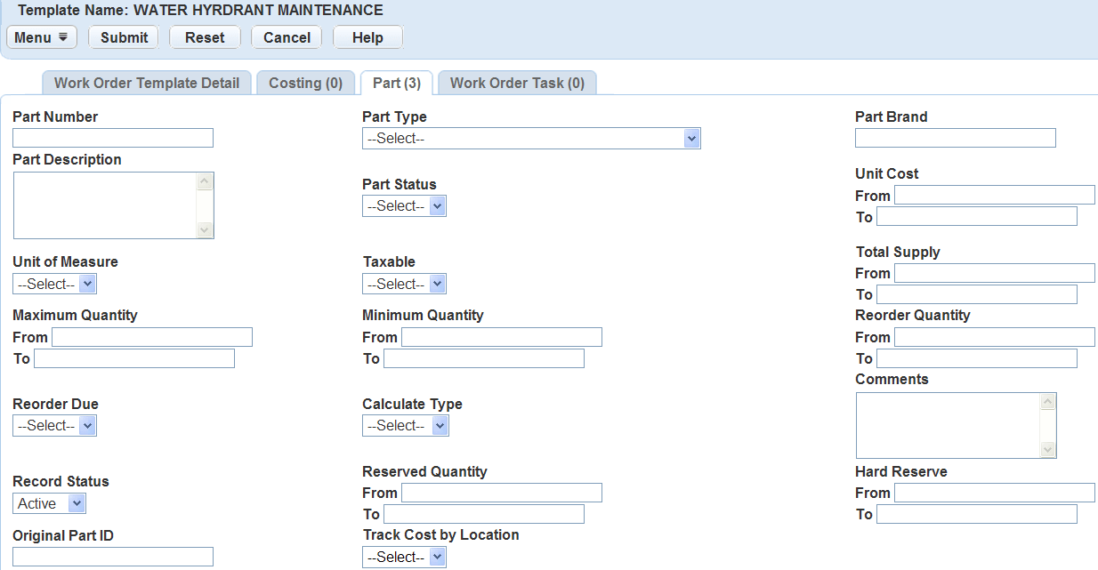 Linking parts to a work order template can eliminate user error and can limit the repetitive and time consuming data entry process of creating work orders. Your agency can define one or more templates and specify the parts to use for specific types of work orders. There are two steps to linking a part to a work order template. You must first find the parts using the lookup and you can then associate one or more parts with the work order template.
