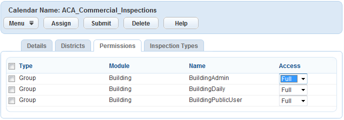You create an inspection type calendar for all the user groups or users that belong to a particular building district. After you assign permissions to a particular user or user group, the inspectors in those groups have permission to view, schedule, and reschedule inspections for the associated calendar type.