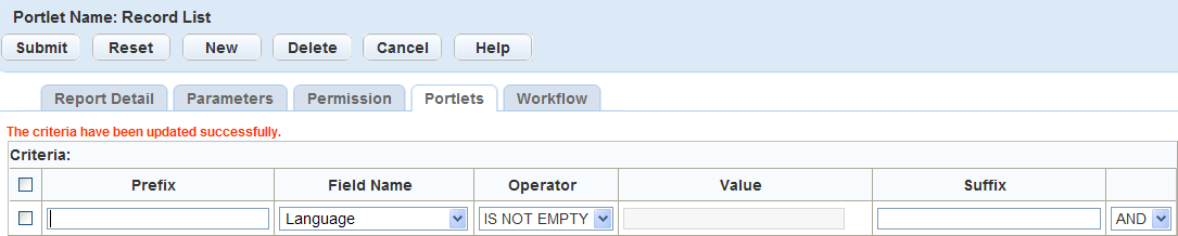 Note: Make sure you remove all blank criteria before submitting the record. If you submit a record with blank criteria, the update fails, Civic Platform deletes the blank record, and you must submit the records again.Civic Platform updates the criteria for the portlet.