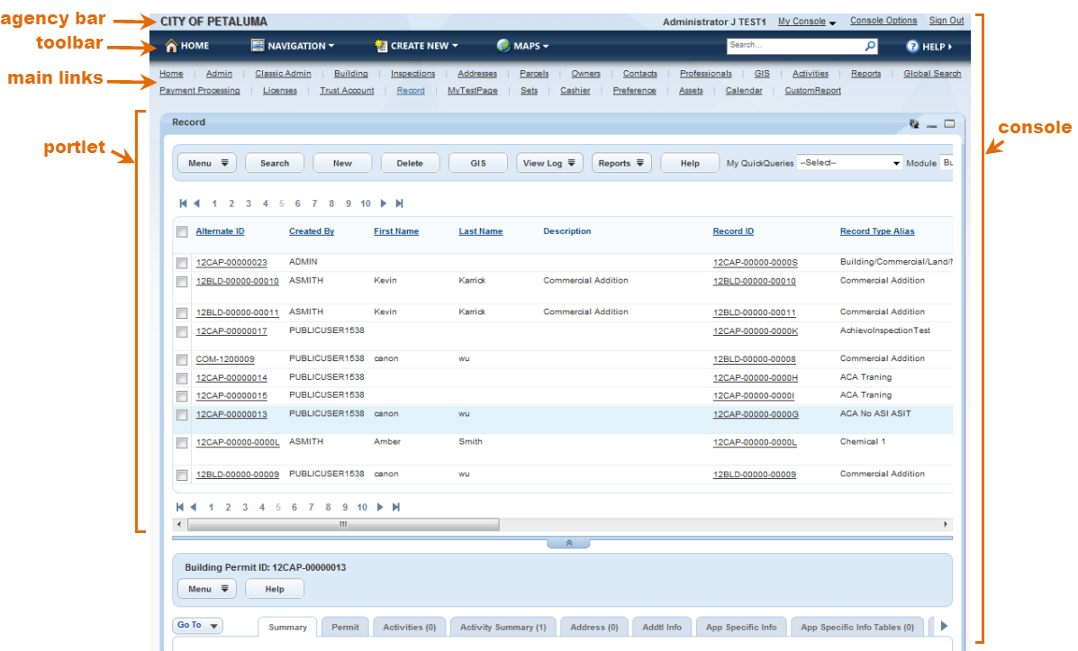 The console refers to the entire working area of your browser that comprises Civic Platform. The console includes an agency bar, toolbars, main links, portlets, record tabs, and detail forms. The console lets you interact with Civic Platform and its add-ons by clicking the main links and working in associated portlets. The following figure shows an example of a console and its associated parts.