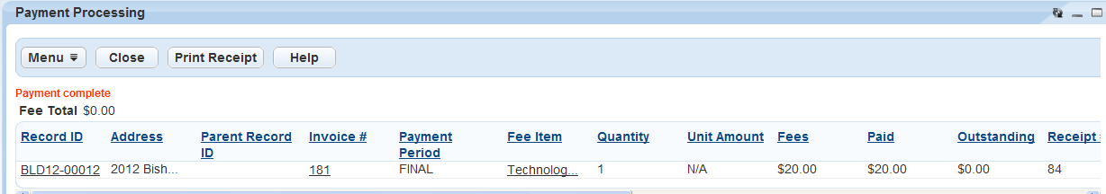 If the payment equals or exceeds the total amount due, the payment is complete. Civic Platform displays a receipt summary and receipt as confirmation of the payments.