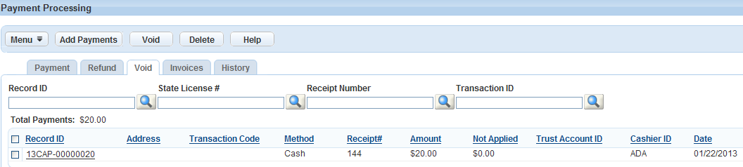 You can view the transaction payment history. When viewing a payment history you can see the transaction ID, date, cashier ID, and total amount. The cashier can also print a receipt for the transaction. If you have any questions regarding a payment contact your agency administrator.