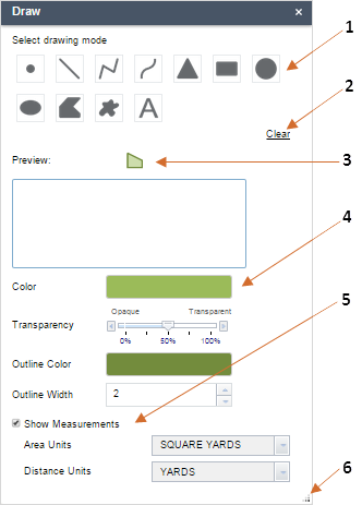 To annotate a map with shapes or text labels, click the Draw icon . The following diagram shows a sample Draw panel: