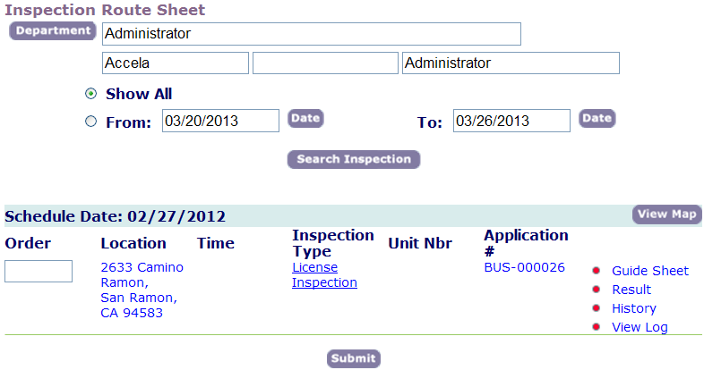 While you are viewing the individual inspections for a particular application, you may want to view the checklist associated with a particular inspection on the route sheet.